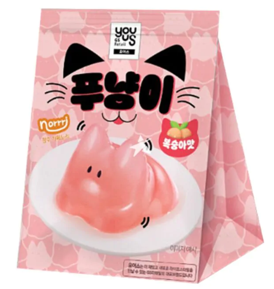 Dit is Punyangi, het meest kawaii jelly snoepje ooit! Deze zachte, wiebelige katvormige jelly is gevuld met de zoete smaak van sappige perzik (복숭아). Perfect voor TikToks, bento boxen of een cute snack plate.