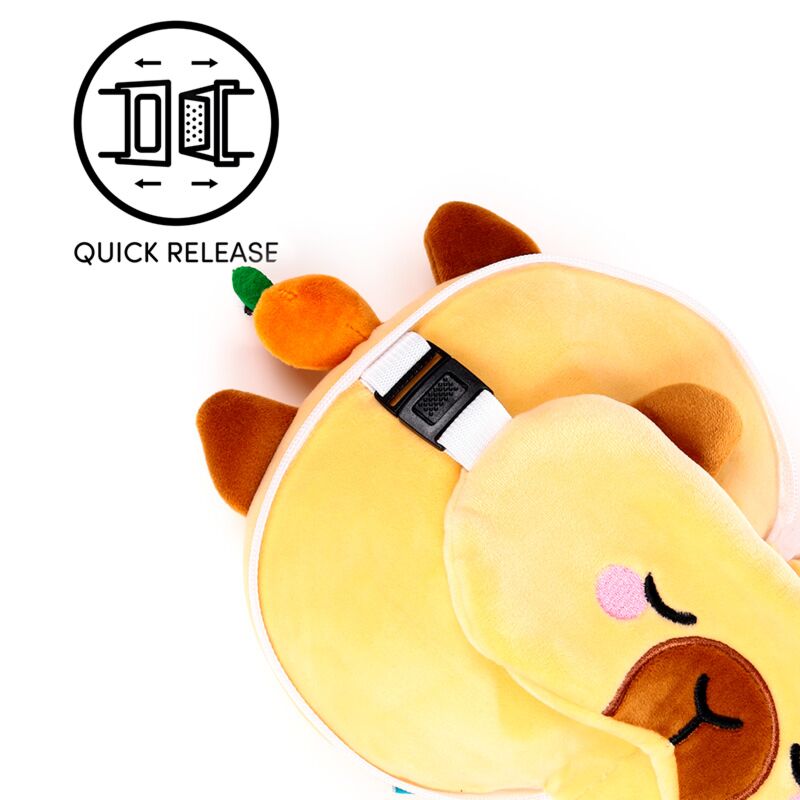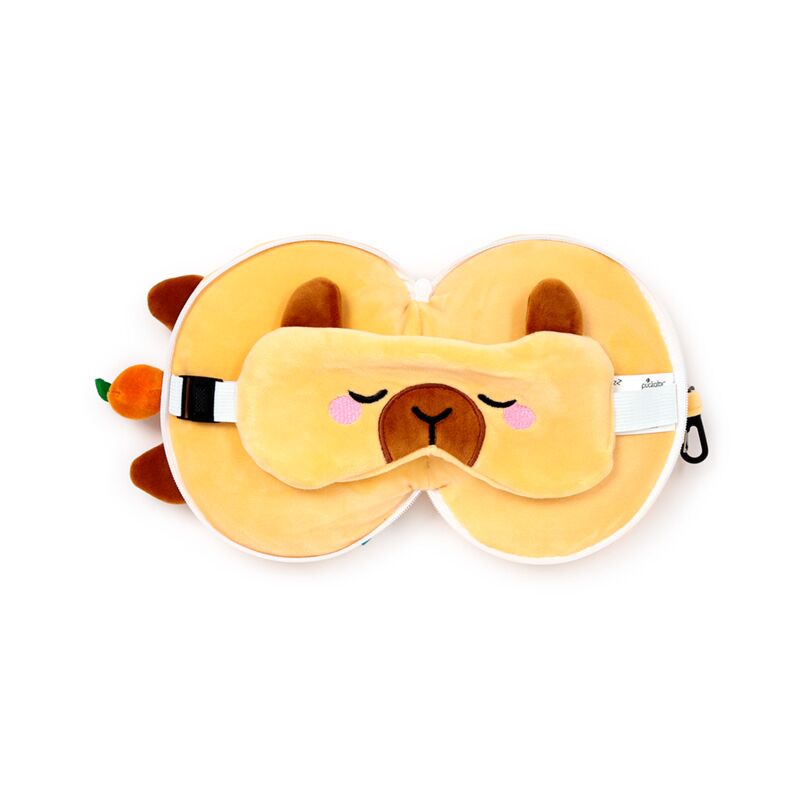 Dé reis & vakantiemusthave! Dit is een klein knuffeltje die je open kunt ritsen, waarna er een klein kussentje ontstaat. Het slaapmasker zit hierop (vast) bevestigd. Dus: als je het slaapmasker opzet zit er een kussentje achterop je hoofd "geplakt".  Zo kun je in de auto, het vliegtuig of de bus heeerlijk slapen. Het is lekker donker en het kussentje zit vast dus blijft lekker achterop je hoofd zitten.